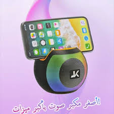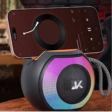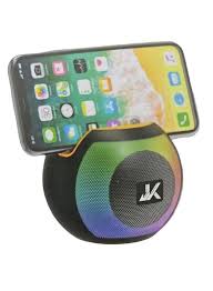 altavoz Bluetooth portátil, identificado específicamente como el modelo JK-P60 o JK-P70 , que cuenta con luces LED RGB integradas y un soporte funcional para colocar un teléfono inteligente.