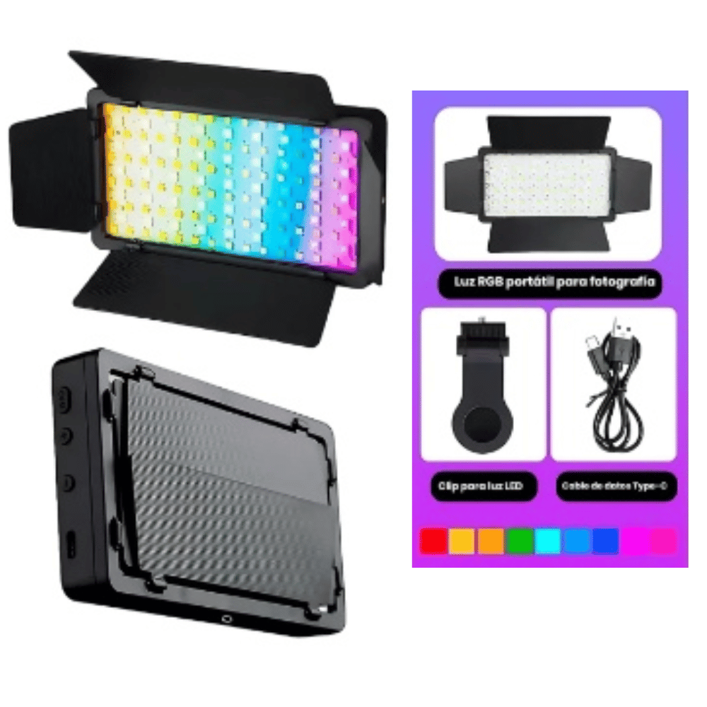 El panel de luz LED profesional es una herramienta ideal para fotografía y video, diseñada para ofrecer una iluminación uniforme que mejora la calidad visual en cualquier tipo de contenido. Su sistema RGB permite seleccionar diferentes colores y efectos de luz, logrando ambientes creativos y adaptables a distintas escenas.