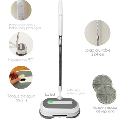Evita agacharte o forzar la espalda. Incluye rotación de 180° para llegar a cualquier rincón.